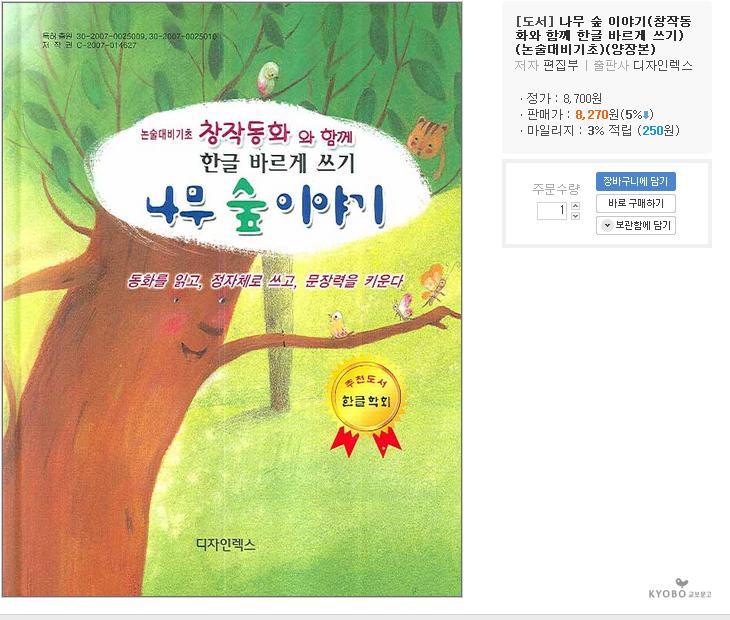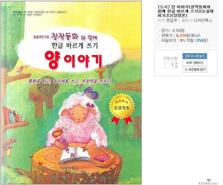 드디어 2008년 3월부터 논술 대비 기초 한글 바르게 쓰기 책 '양 이야기'와 '나무 숲 이야기'를 출간하여 교보문고와 영풍문고 등 네이버나 다음 사이트에서 '양 이야기' '나무 숲 이야기'를 처 보세요. 자세히 보실 수 있습니다.
