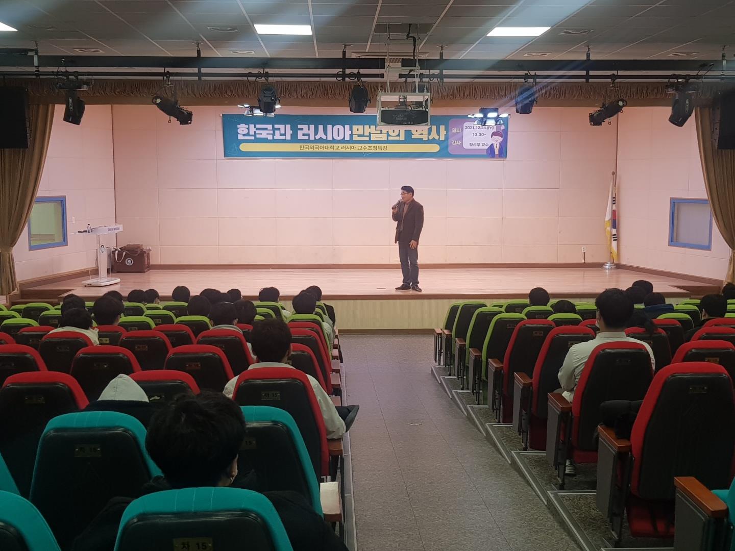 러시아연구소 ( 소장 노어과 표상용 교수 ) 는  2021 년  11 월  2 ( 울산외국어고등학교 , 12 월  24 ( 속초고등학교 등 두 차례에 걸쳐  HK+  지역인문학센터 사업 일환으로 학문후속세대를 위한  인문강좌 를 진행했다 강의를 담당한 황성우 교수는 울산외국어고등학교에서  한국과 러시아 극동에서 만나다 ,”  속초고등학교에서  우리에게 러시아는 한국과 러시아 만남의 역사 라는 주제를 통해 러시아와 우리나라의 오랜 만남의 역사와 미래의 교류 필요성을 강조했다 .