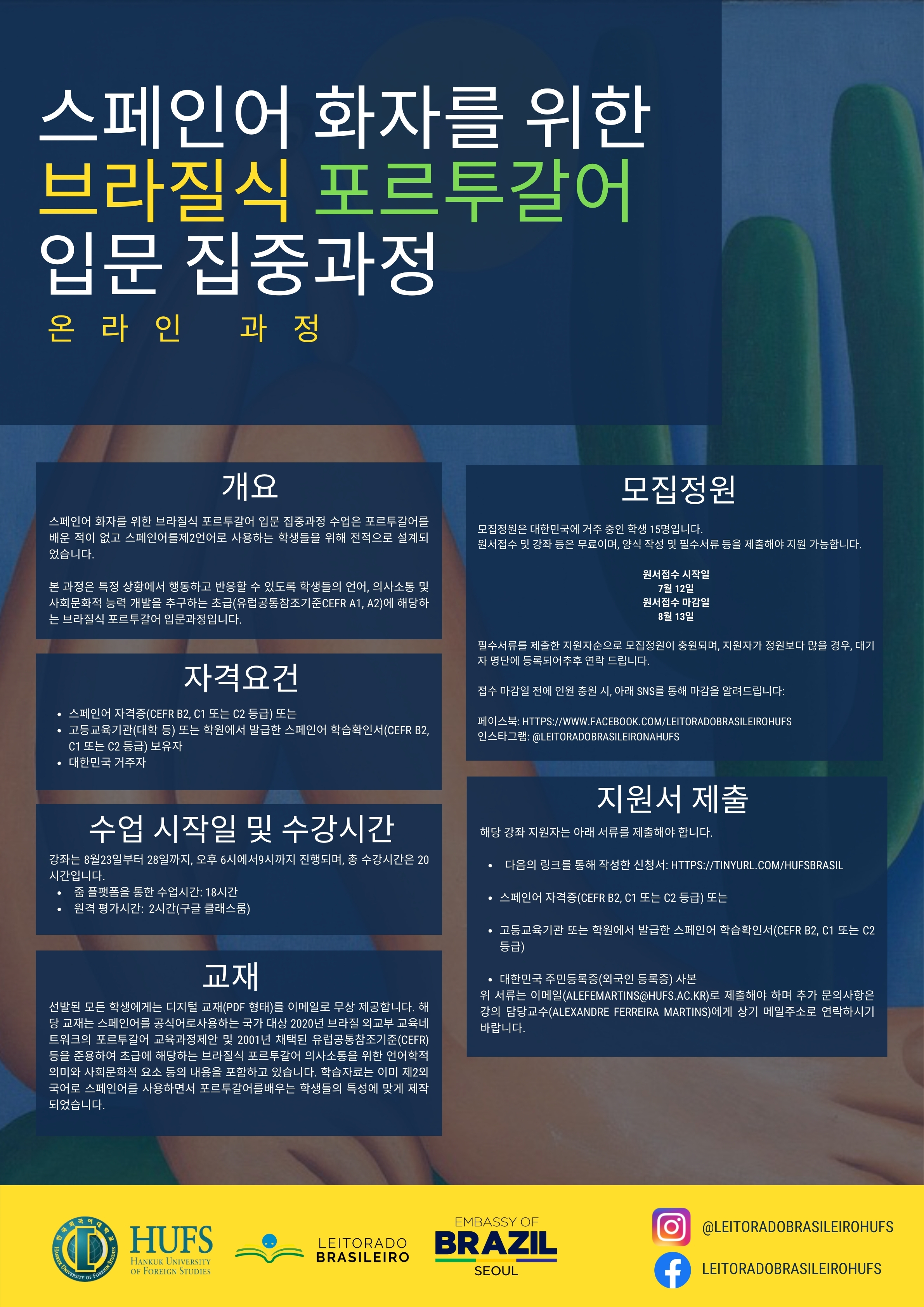 한국외국어대학교 포르투갈어과는 주한 브라질대사관과 공동으로 2021년 여름 방학에 스페인어 전공 학생을 대상으로 아래와 같이 브라질식 포르투갈어 입문 집중 과정 (온라인 과정)을 개설해 운영할 계획입니다관심있는 학생들의 많은 참여 부탁드립니다.