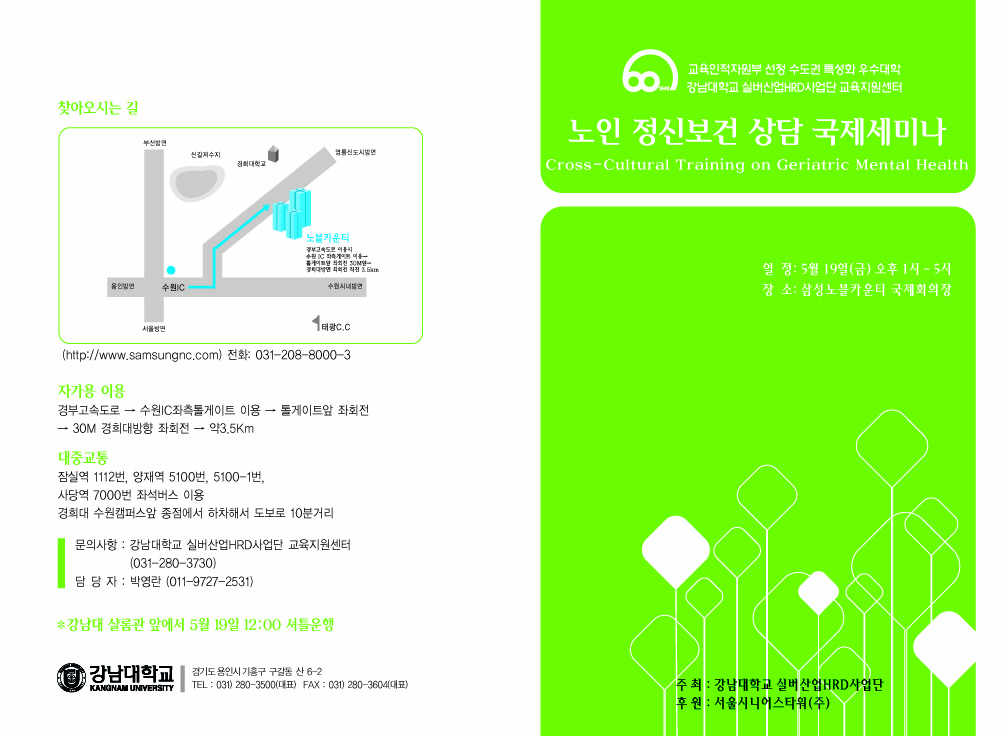 강남대학교 실버산업HRD사업단 교육지원센터에서는 아래와 같이 노인 정신보건 상담 국제세미나를 개최하고자 하오니 참석 부탁드립니다.