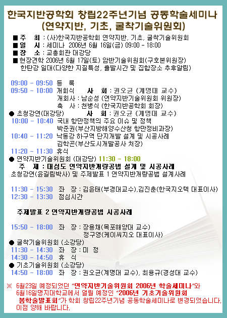 한국지반공학회 창립22주년 기념 기술위원회 공동학술세미나 및 현장견학 안내