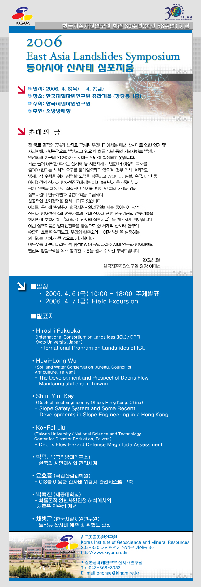한국지질자원연구원 산사태재해연구팀에서는 동아시아 산사태 심포지움을 아래와 같이 개최하오니 관심있는 분들의 많은참석바랍니다.