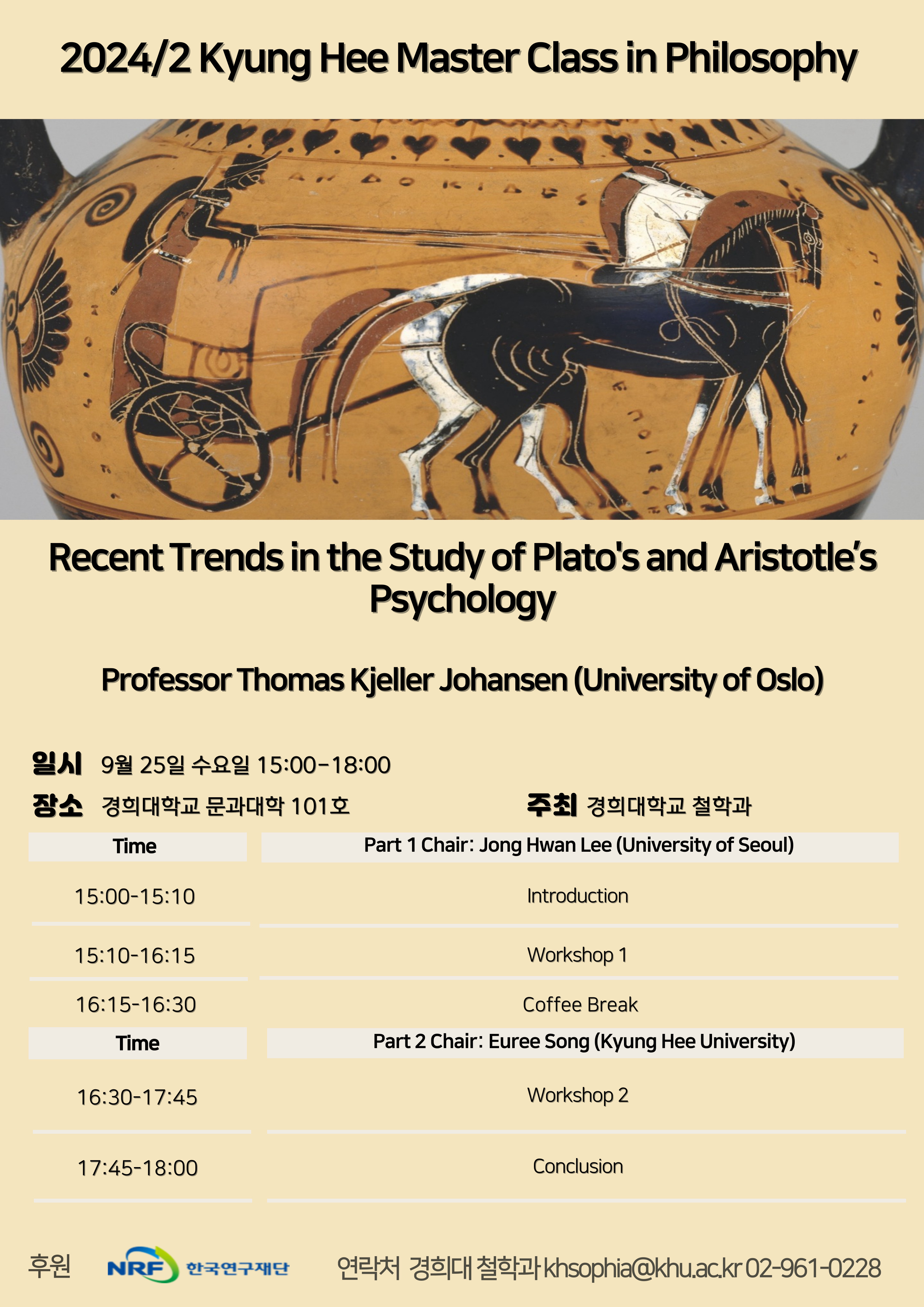 9월 25일 (수) 오후 3시부터 6시까지 플라톤과 아리스토텔레스의 영혼론에 대한 최신 연구 동향에 대한 강연 및 워크샵이 열리고, 27일 (금) 오후 2시부터 6시까지 Eupatheia: Happiness and Emotion in Ancient Philosophy라는 주제하에 한국외대 장영란 교수와 숭실대 장미성 교수, 그리고 Johansen 교수의 강연을 청해 듣는 자리를 마련했습니다. 장소는 경희대학교 문과대학 101호입니다. 자세한 사항은 포스터를 참고해 주시기 바랍니다. 이 두 행사는 한국연구재단의 국제협력프로젝트 "Eupatheia: 고대철학에서 행복과 감정의 관계" 의 지원을 받았습니다.