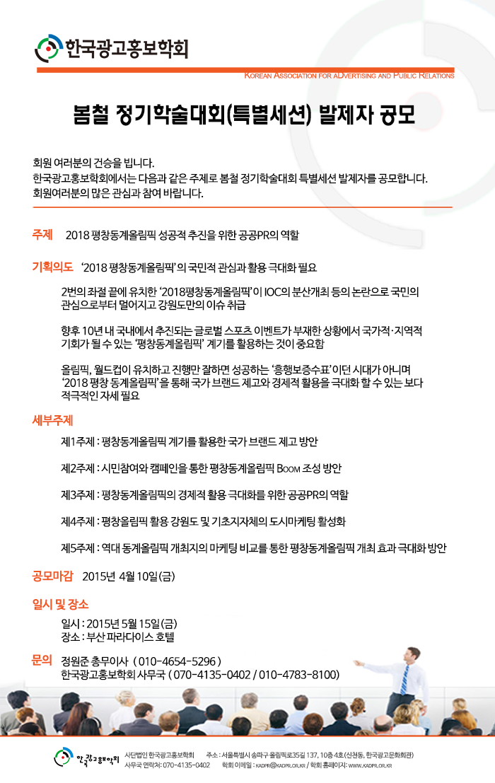 <2018 평창동계올림픽 성공적 추진을 위한 공공PR의 역할> 봄철 정기학술대회(특별세션) 발제자 공모