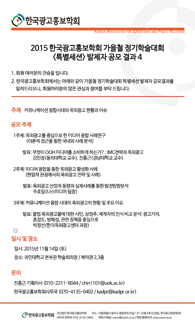 [공모결과] <커뮤니케이션 융합시대의 옥외광고 현황과 이슈> 가을철 정기학술대회(특별세션) 발제자 공모결과