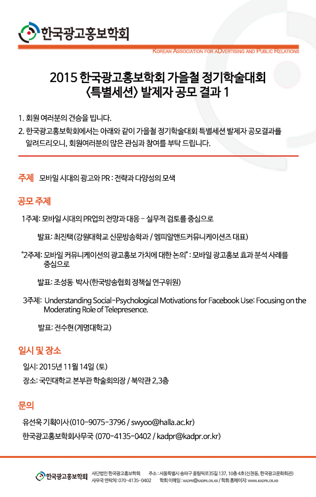[공모결과] <모바일 시대의 광고와 PR : 전략과 다양성의 모색> 가을철 정기학술대회(특별세션) 발제자 공모결과