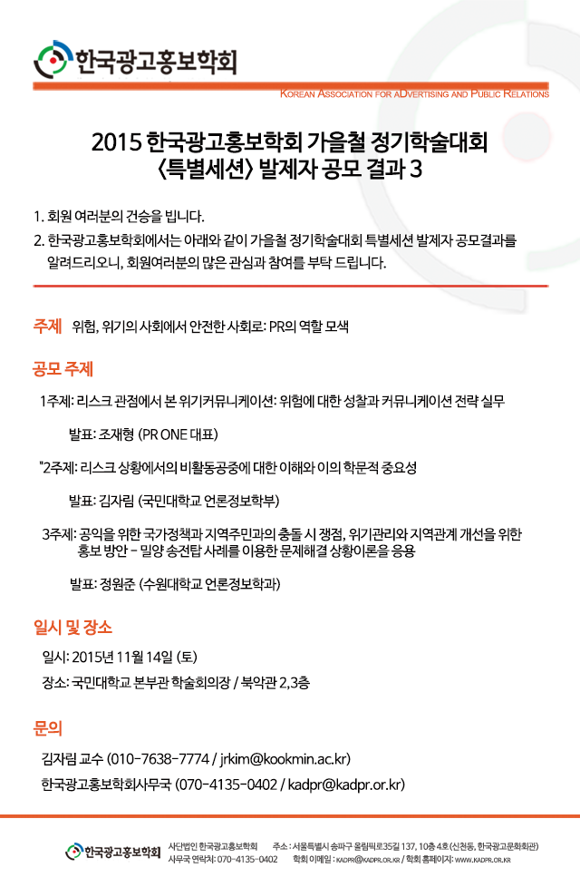 [공모결과] <위험, 위기의 사회에서 안전한 사회로 PR의 역할 모색> 가을철 정기학술대회(특별세션) 발제자 공모결과