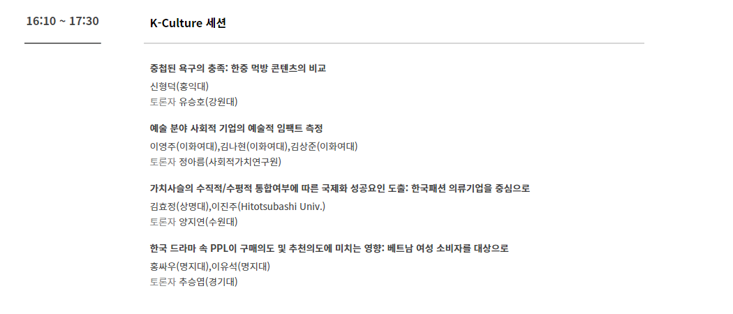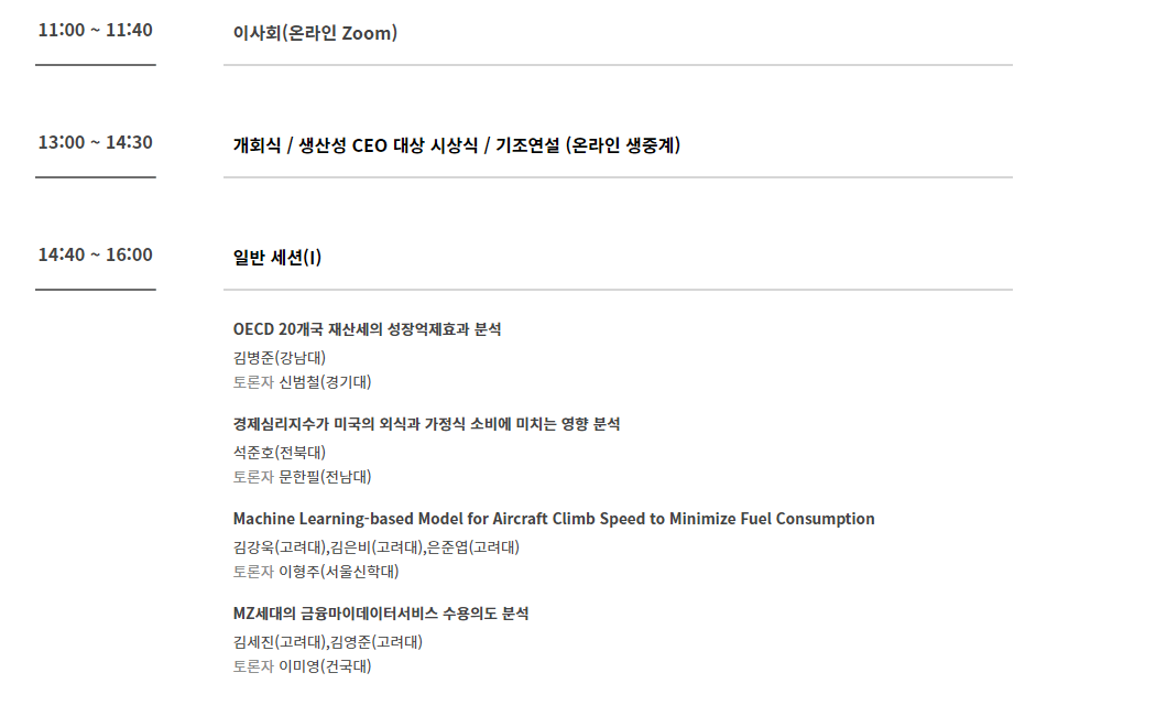 공공기관인 한국관광공사에 대한 생산성 CEO 대상 시상식, 그리고 학술발표 세션들(K-Culture 세션, 자동차시장 세션, 일반발표 세션 등)이 진행됩니다.