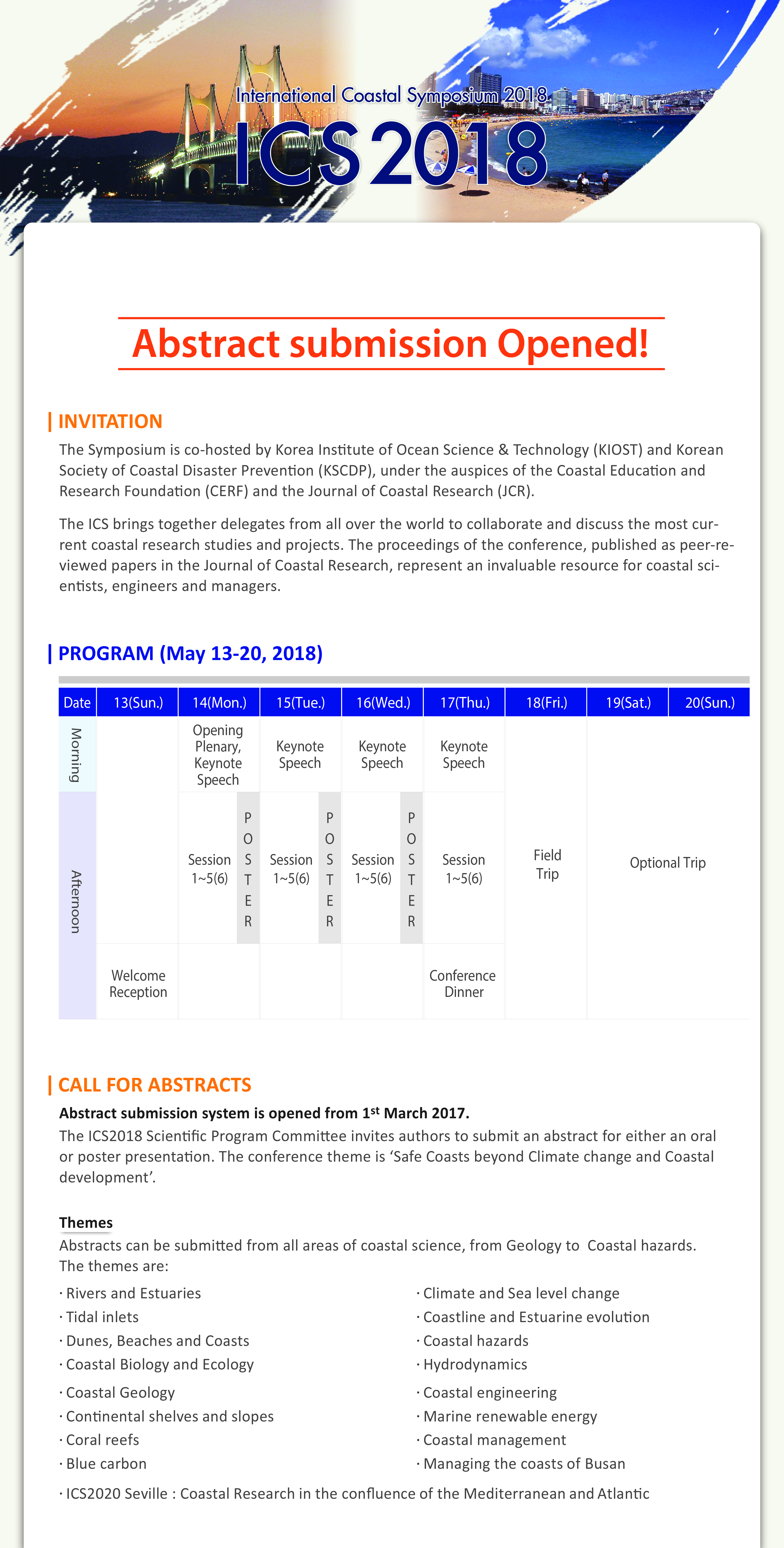 3월 1일부터 Climate change, Coastal Hazards, Coastal Engineering 등 17개 다양한 세션에서 초록을 접수하고 있사오니 관심있는 분들의 많은 참여 바랍니다.