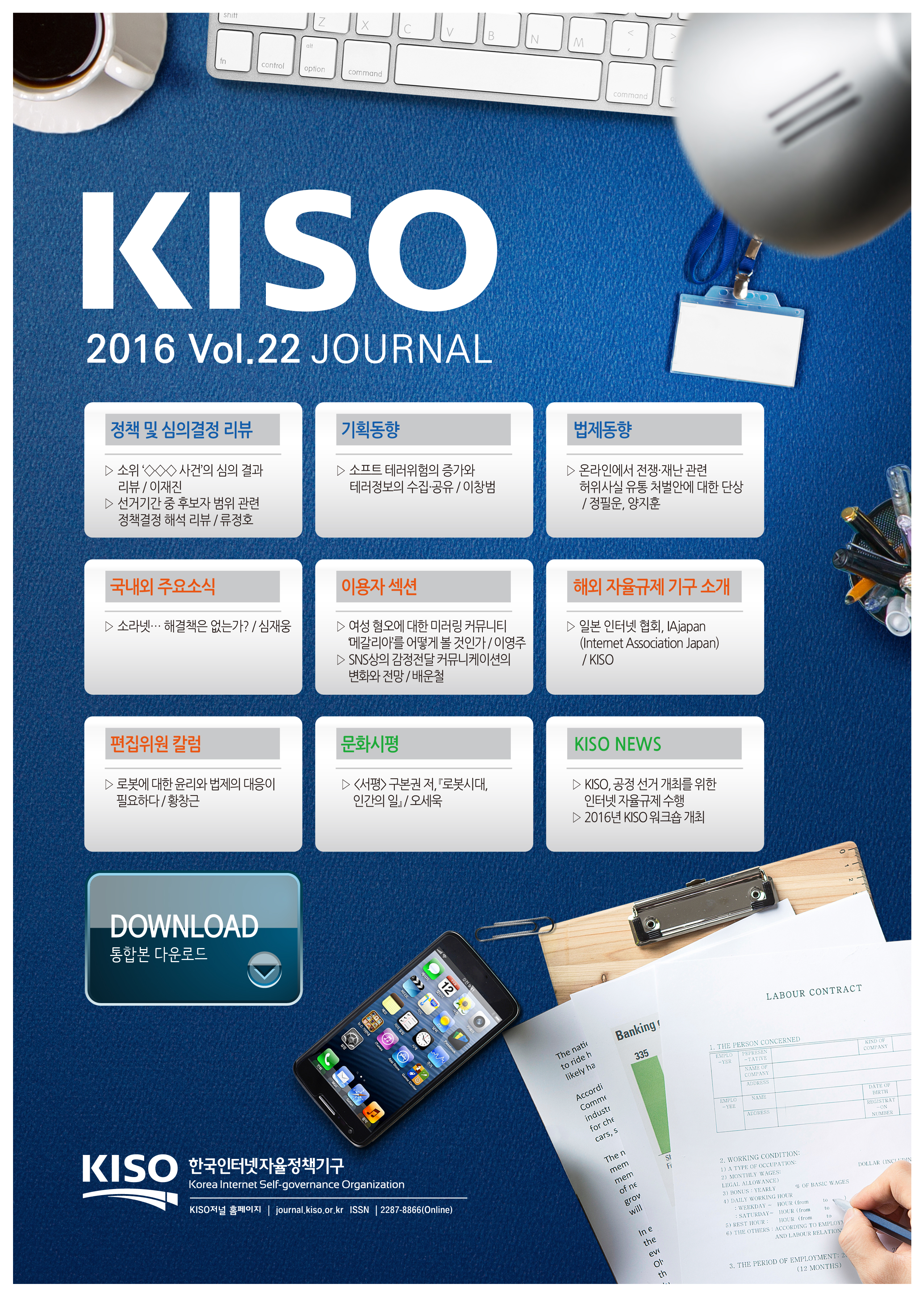 1) 제목: 한국인터넷자율정책기구의 KISO저널 제22호 발간