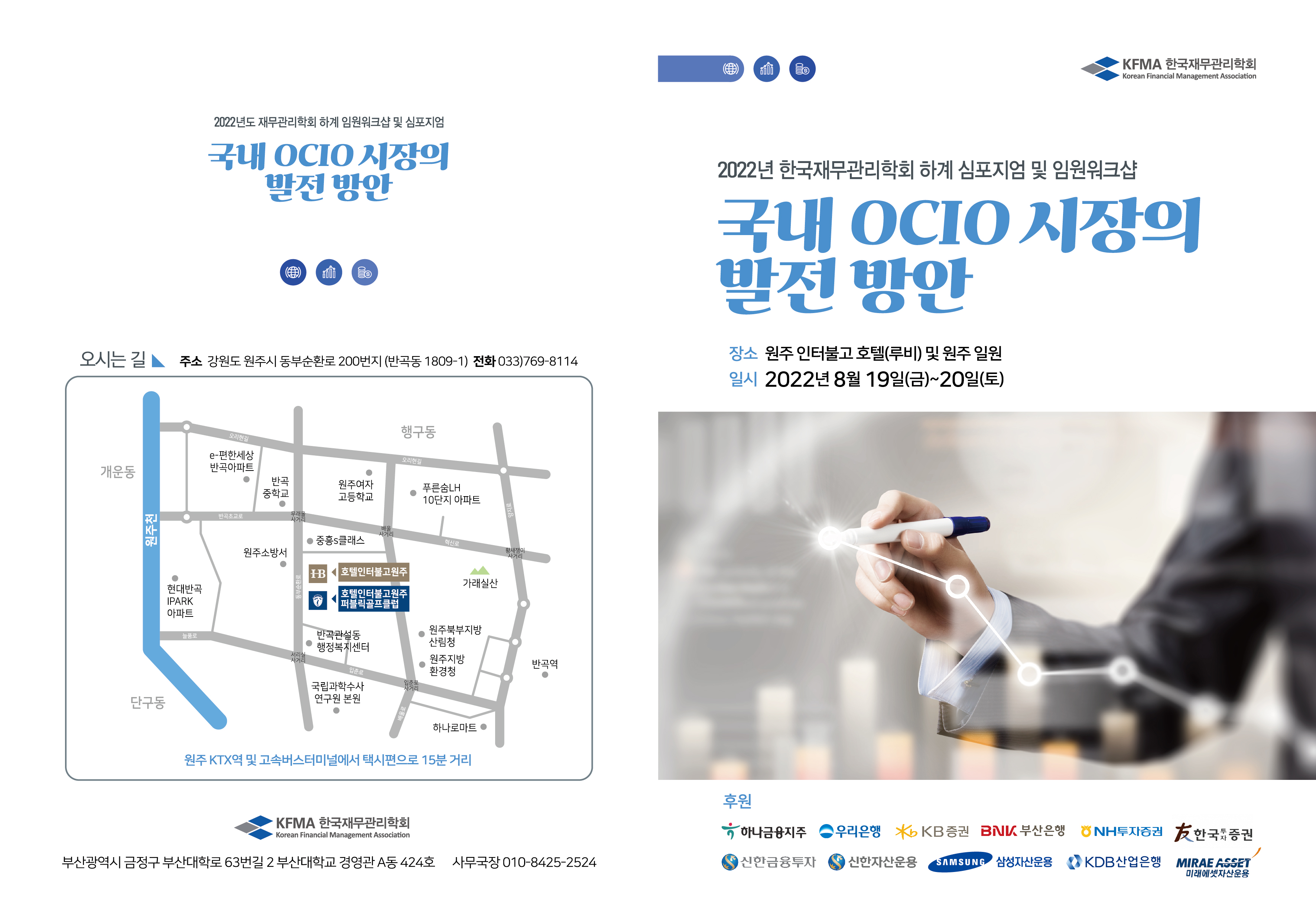 2022년 8월 19일(금)~ 20일(토), 원주에서 “한국재무관리학회 하계 심포지엄 및 임원워크샵”를 아래와 같이 개최합니다.