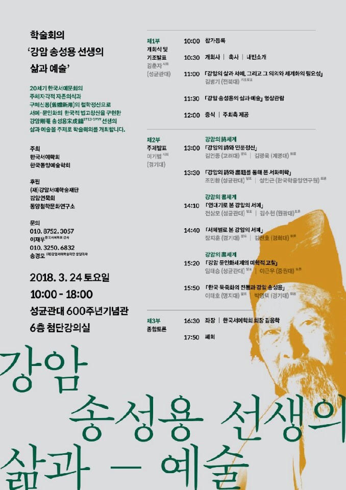 간재학회 회원님들께 한국서예학회와 한국동양예술학회가 공동주최하고, (재)강암서예학술재단, 강암연묵회, 동양철학문화연구소가 후원하는 학술회의 '강암 송성용 선생의 삶과 예술'를 안내해드립니다. 일시: 2018년 3월 24일 토요일 10:00-18:00 장소: 성균관대 600주년 기념관 6층 첨단강의실 |