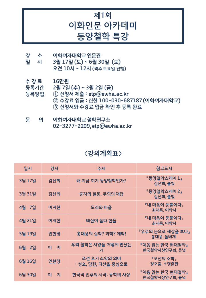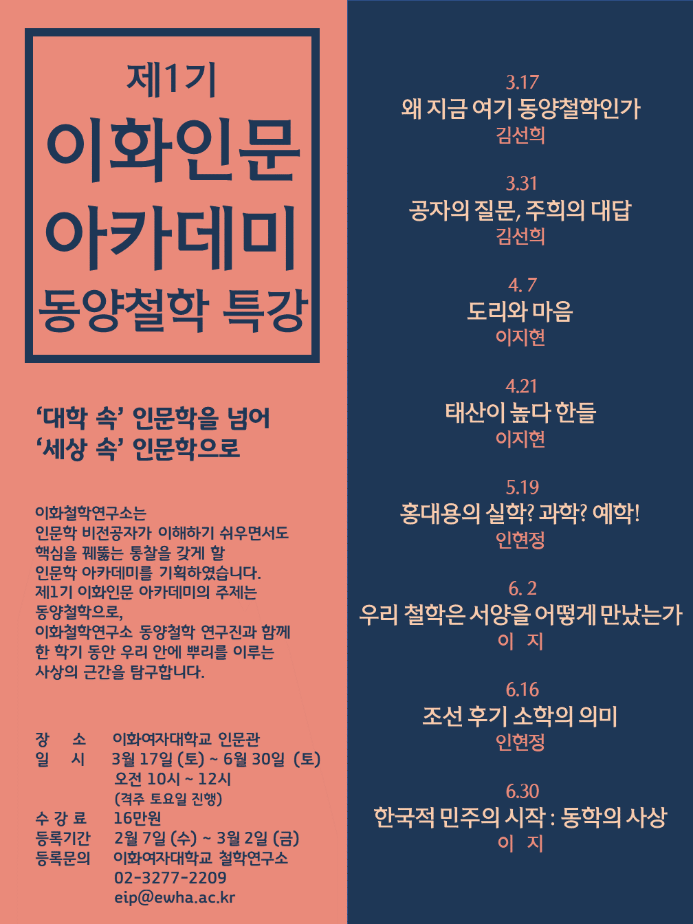 인문학 비전공자 대상 〈제1기 이화인문 아카데미-동양철학 특강〉 - 일시 : 3월 17일 ~ 6월 30일 (총 8회 격주 토요일) - 장소 : 이화여자대학교 인문관 - 강연자: 3/17 김선희, 3/31 김선희, 4/7 이지현, 4/21 이지현, 5/19 인현정, 6/2 이지, 6/16 인현정, 6/30 이지 - 등록기간 : 2월 7일 (수) ~ 3월 2일 (금) - 등록방법과 강의계획표는 포스터 및 안내문을 참조 (첨부파일) - 문의 : 이화여자대학교 철학연구소 (02-3277-2209, eip@ewha.ac.kr) |
