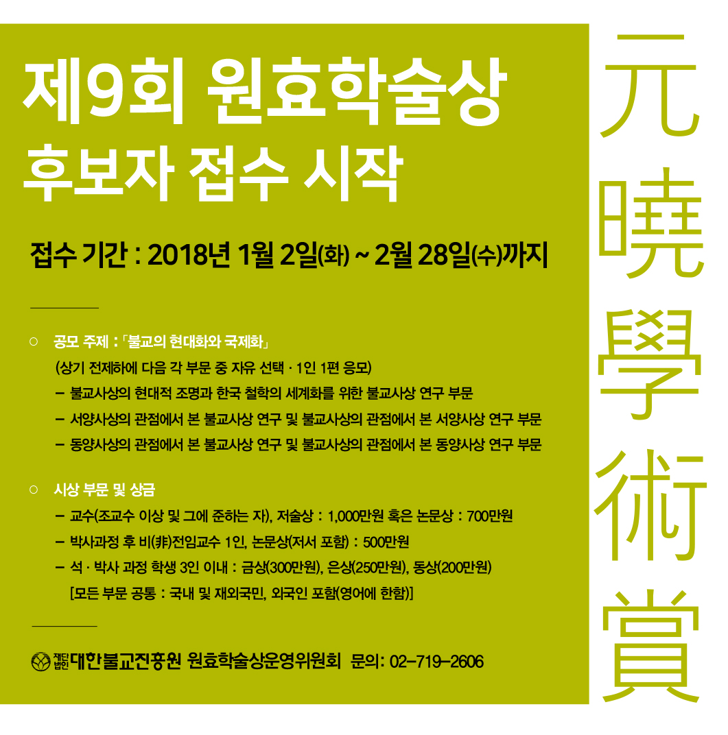 제9회 원효학술상 공모 접수가 시작되었습니다.