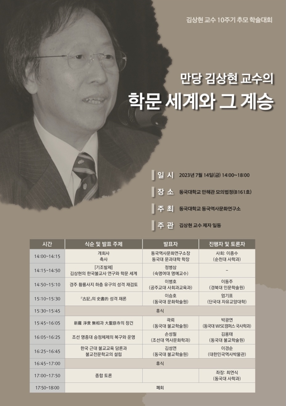 김상현 교수 작고 10주기를 맞아 그 학문적 업적을 기리는 추모 학술대회를 개최하고자 합니다. 김상현 교수는 화엄, 원효, 삼국유사, 사찰 등의 고대 불교 사상과 문화, 동아시아 불교, 고려조선시대 불교, 근대 불교 등의 다방면에 걸쳐 한국 불교와 역사 연구의 수준을 심화하고 지평을 넓히는 데 크게 기여하였으며, 후학 양성에도 힘썼습니다. 이번 학술대회는 그 학문적 업적을 기억하는 한편, 그 제자들이 김상현 교수의 뜻을 이어 연구한 성과를 발표하고 학계의 유수한 연구자들과 함께 논의하기 위해 마련되었습니다. 김상현 교수의 학적과 학은을 기리는 이 학술대회에 많은 관심과 참석 바랍니다.