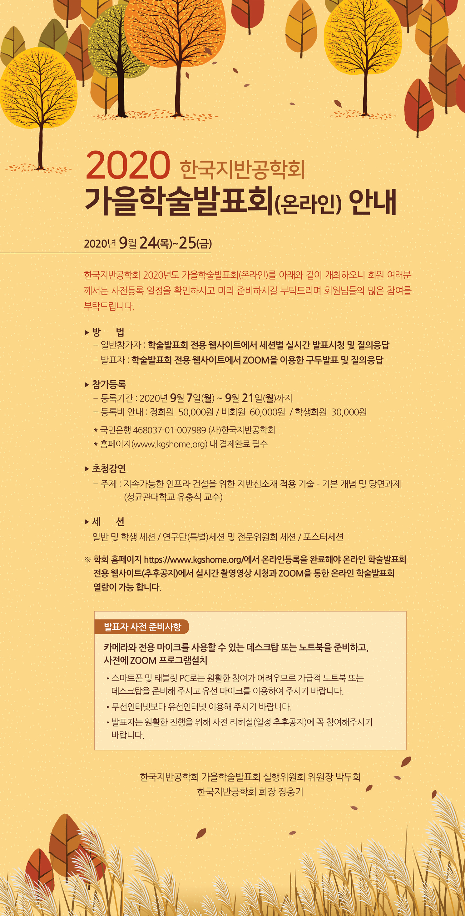 2020년 한국지반공학회 가을학술발표회(온라인)를 아래와 같이 개최하오니, 회원여러분들의 많은 참여를 부탁드립니다.