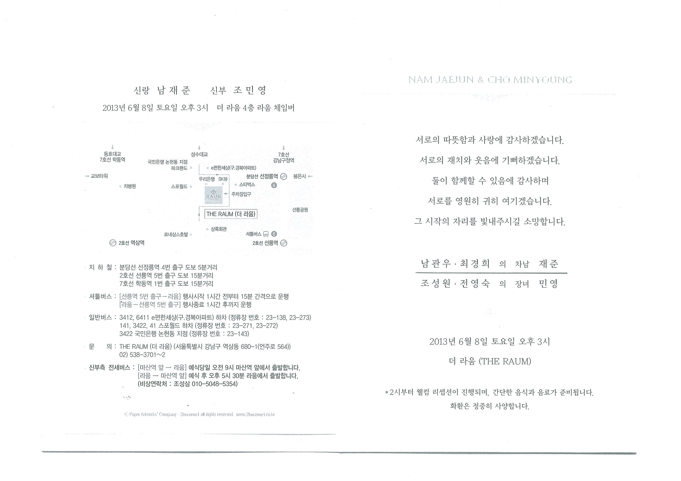 우리학회 회원이신 대보건설(주) 남관우 부사장의 자녀(차남 남재준) 혼사가 아래와 같이 있사오니, 회원여러분들의 많은 축복바랍니다.