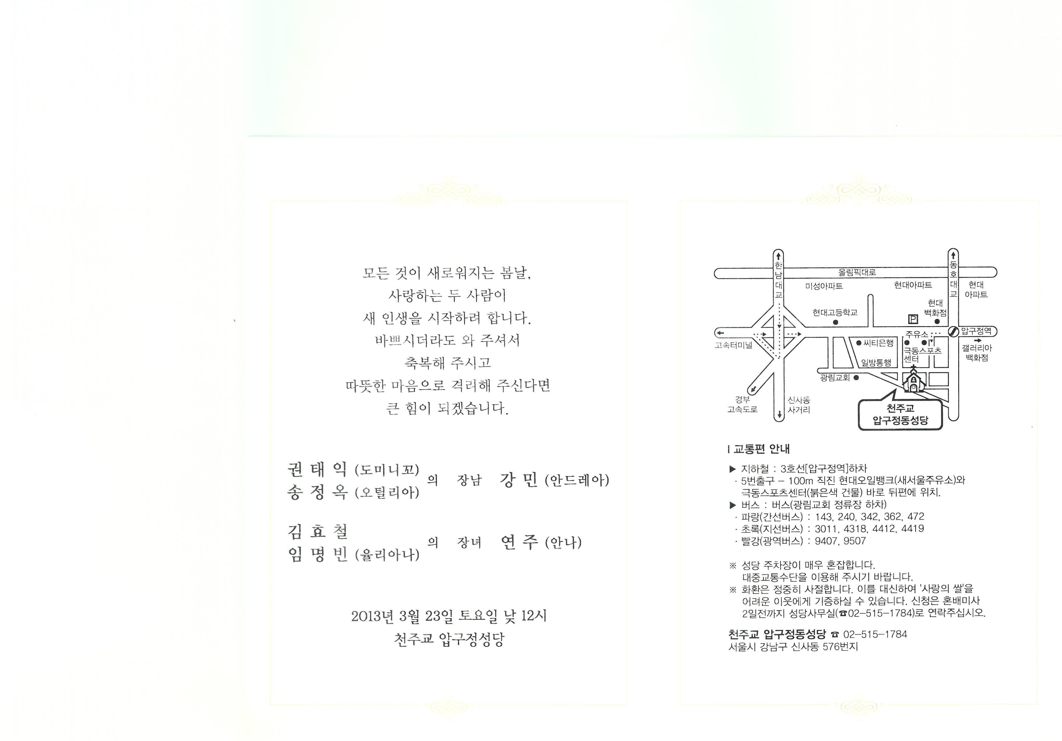 우리학회 회원이신 (주)이산 도로감리본부 김효철 부사장의 자녀 혼사가 아래와 같이 있사오니, 회원여러분들의 많은 축복바랍니다.