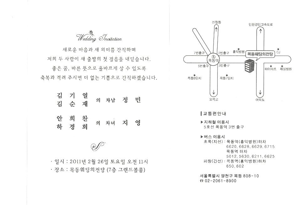 축하합니다 ^ㅡ^안희찬(인천경제자유구역청) 회원님의 차녀 결혼식이 다음과 같이 있어 안내해 드립니다. 일시 : 2011년 2월 26일 (토) 오전 11시 장소 : 목동웨딩의전당(7층 그랜드볼룸)
