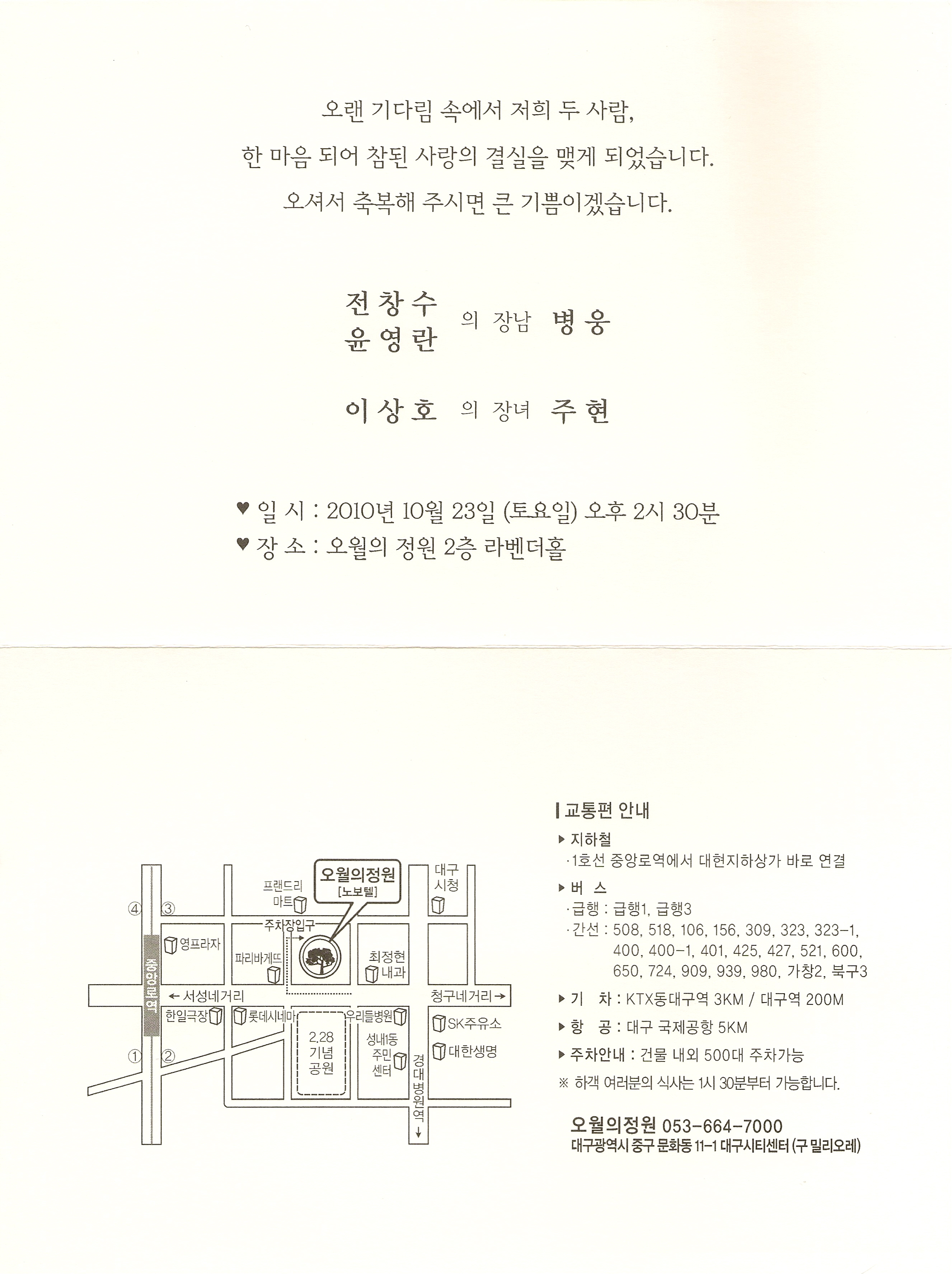 장 소 : 오월의 정원 2층 라벤더홀(대구 중구 문화동 11-1)전화 053-664-7000