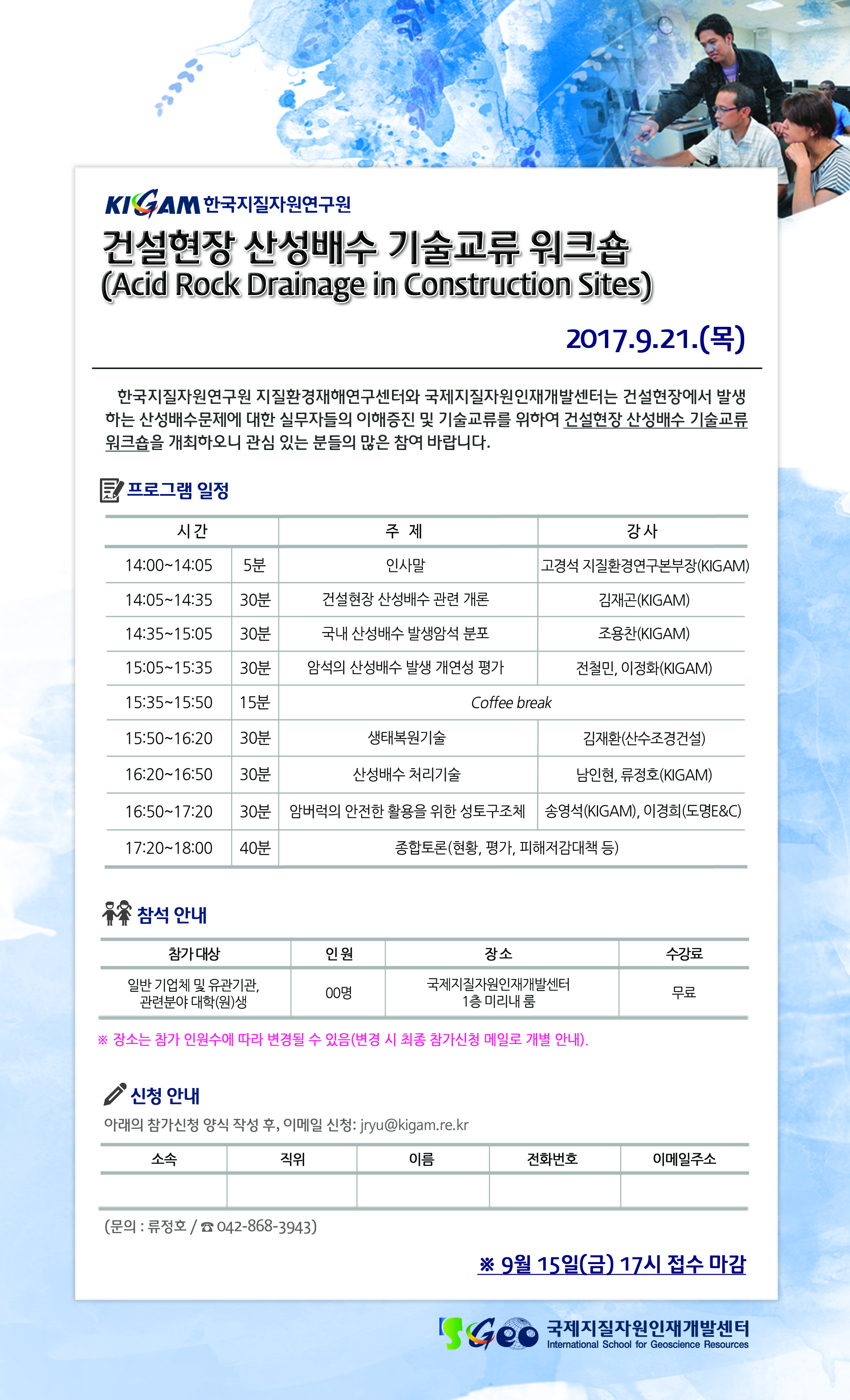 한국지질자원연구원 지질환경재해연구센터와 국제지질자원인재개발센터에서는 건설현장에서 발생하는 산성배수문제에 대한 실무자들의 이해증진 및 기술교류를 위하여 건설현장 산성배수 기술교류 워크숍을 개최합니다. 회원여러분들의 많은 관심과 참여 부탁드립니다.