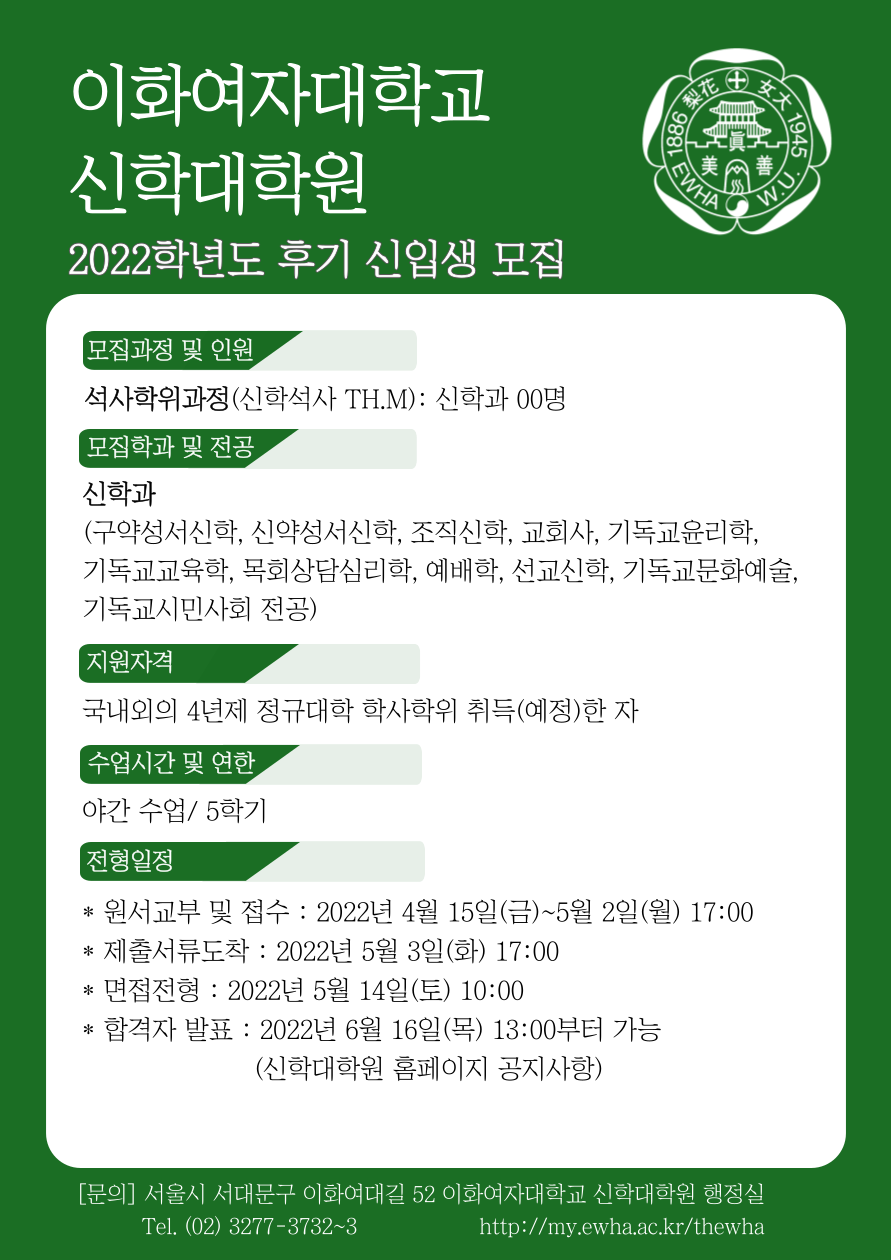 [이화여자대학교 신학대학원] 2022학년도 후기 신입생 석사과정 모집