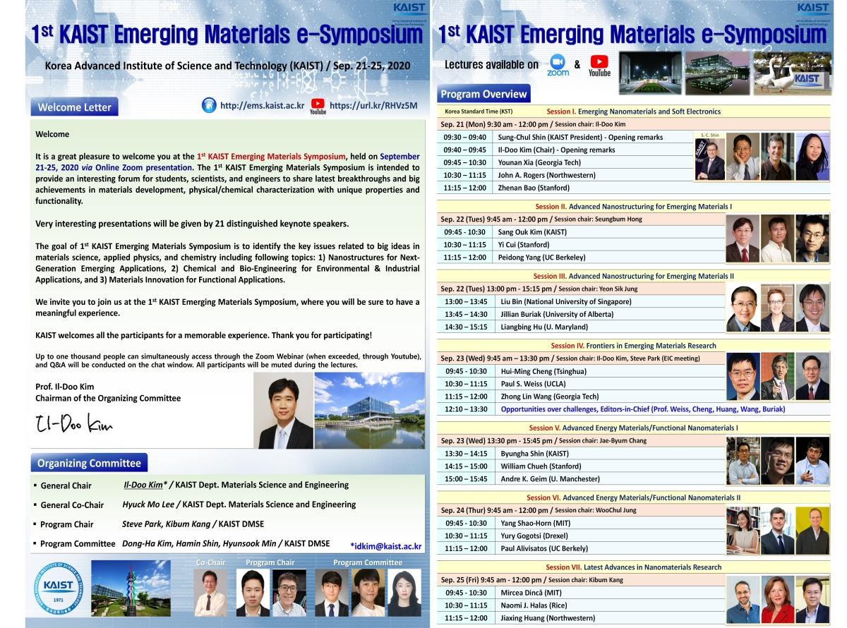 It is a great pleasure to welcome you at the 1st KAIST Emerging Materials Symposium, held on September 21-25, 2020 via Online Zoom presentation.