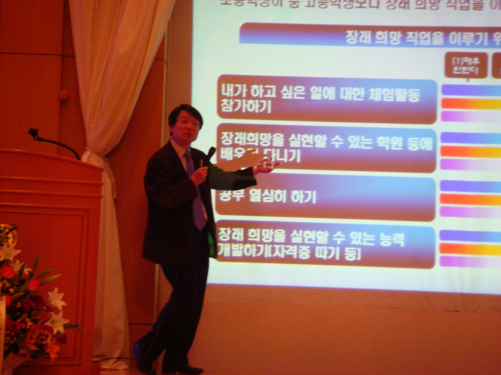 | 제 3부- 16:10~17:50 주제발표- 직업 및 진로지도를 위한 운영 방안 좌장: 김병숙(경기대학교) 주제 4: 진로교육 실태 분석에 따른 활성화 방안 발표: 김선호(한국고용정보원) 토론: 김대관(교육과학기술부 진로취업지원과 |