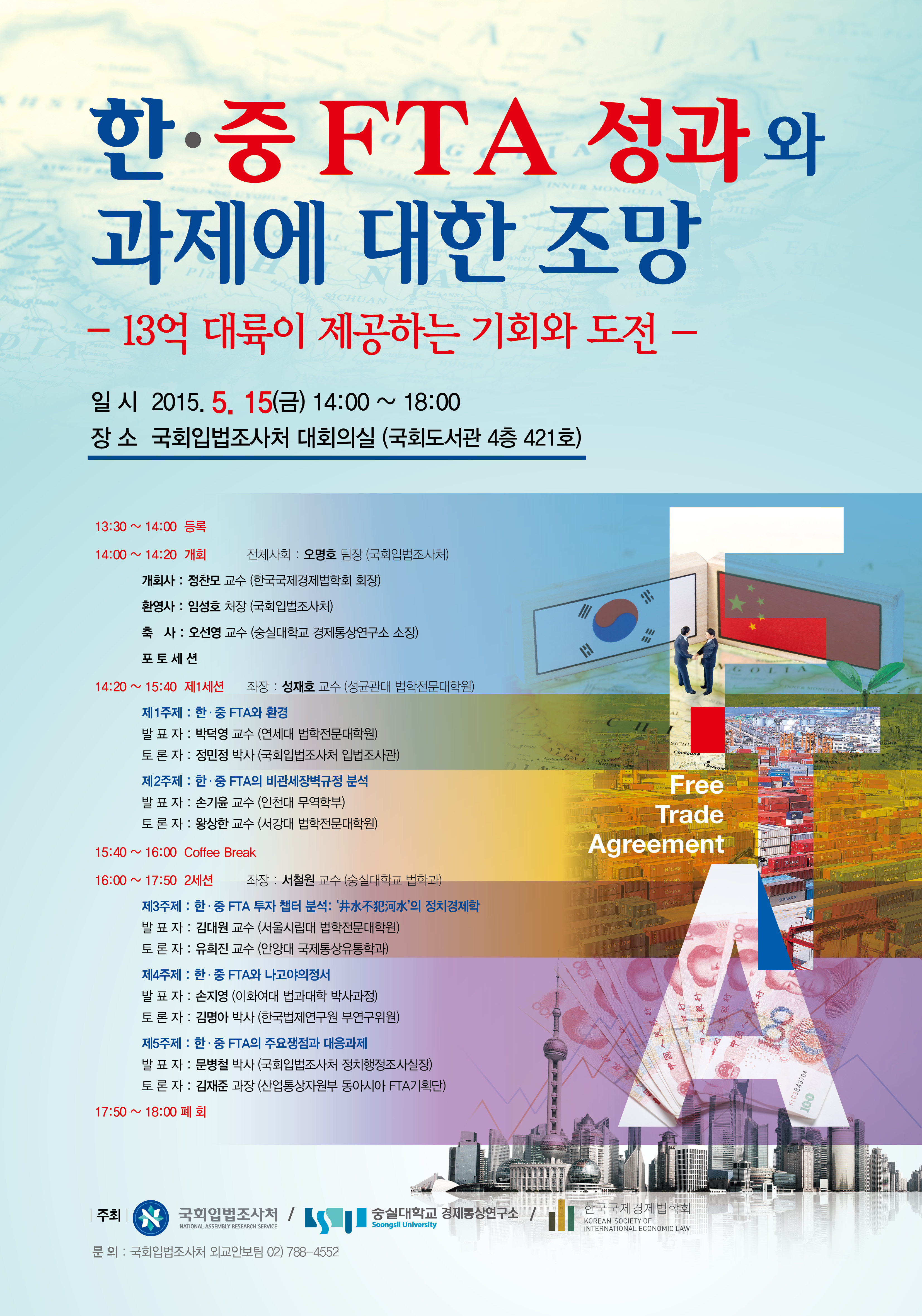 오늘은 다름이 아니오라, 5월 학술대회를 공지해드리고자 이메일을 드립니다. 원래는 4월 신진학자 대회와 6월 한중 학술대회(6월 22- 24일, 중국 하문대학교)를 진행할 예정이었으나, 한-중 FTA가 가서명됨에따라 국회에서 많은 관심을 가지고 저희 학회측에 공동 학술대회를 제안하였습니다.
