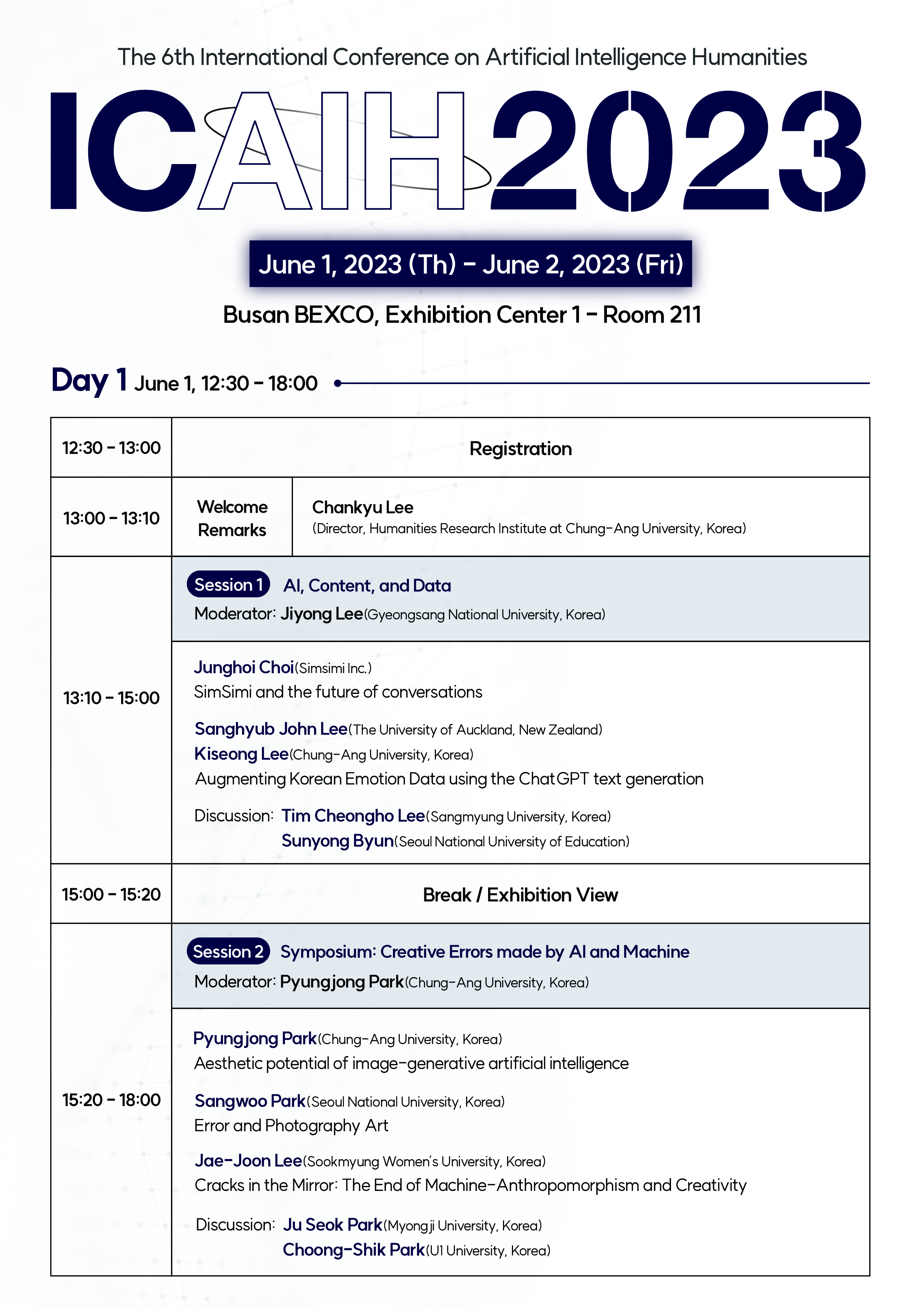 인공지능 인문학 구축 및 정착을 위한 학제 간 연구교류와 사업단 연구 성과를 공유하기 위해 제 6회 인공지능 인문학 국제학술대회(ICAIH2023)를 2023년 6월 1일, 2일 양일간 진행합니다.