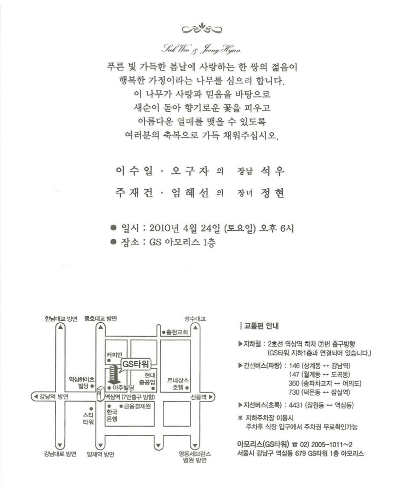 축하합니다!다산ENG 주재건 회장 장녀의 결혼식이 아래와 같이 있습니다.- 아 래 - 일 시 : 2010년 4월 24일(토요일) 오후 6시장 소 : GS 아모리스 1층청첩장을 첨부하여 드리오니 참고하시기 바랍니다.