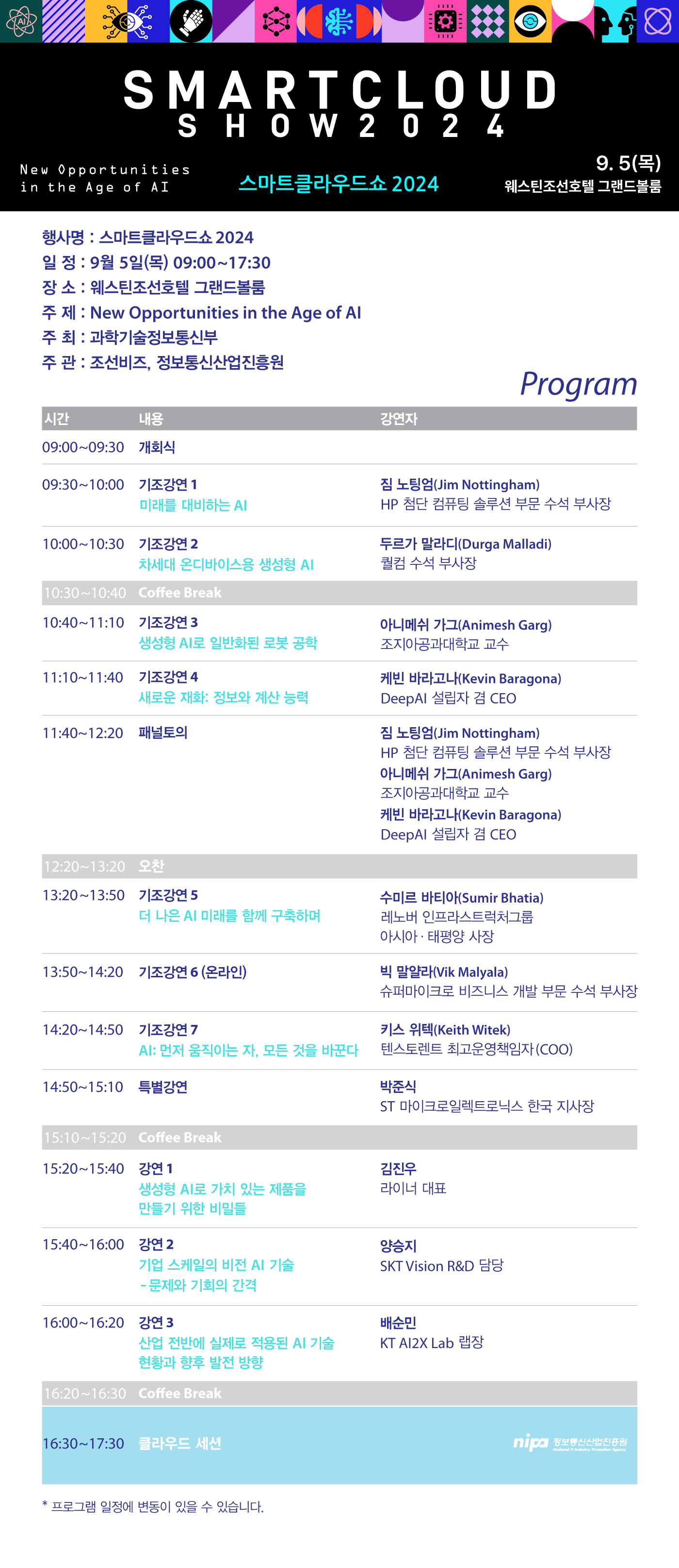 짐 노팅엄(Jim Nottingham) HP 첨단 컴퓨팅 솔루션 부문 수석 부사장, 두르가 말라디 (Durga Malladi) 퀄컴 수석 부사장, 아니메쉬 가그 (Animesh Garg) 조지아공대 교수, 케빈 바라고나(Kevin Baragona) DeepAI 창업자 겸 CEO 등 테크 산업의 최전선에서 AI 혁신을 이끄는 최정상급 국내외 전문가가 참여해 AI의 새로운 기회에 직면하기 위한 전략을 공유하고자 합니다.