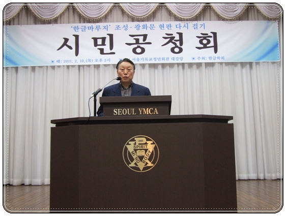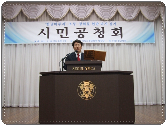 ▲ 2011년 2월 11일 오후 2시부터 서울기독교청년회관(YMCA, 종로2가) 대강당에서 열린 '한글마루지 조성/광화문 현판 다시 걸기 시민 공청회'의 모습. 3분 의견 발표를 하고 있는 이태길 님(사진 위)과 한류전략연구소 신승일 소장(아래 사진)의 모습.