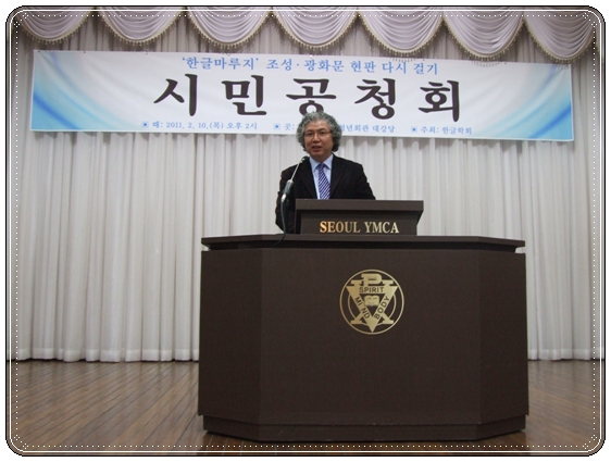 ▲ 2011년 2월 11일 오후 2시부터 서울기독교청년회관(YMCA, 종로2가) 대강당에서 열린 '한글마루지 조성/광화문 현판 다시 걸기 시민 공청회'의 모습. 3분 의견 발표를 하고 있는 김광옥 전 방송통신학회 회장(위 사진)과 이주형 한글서예가(아래 사진)의 모습.