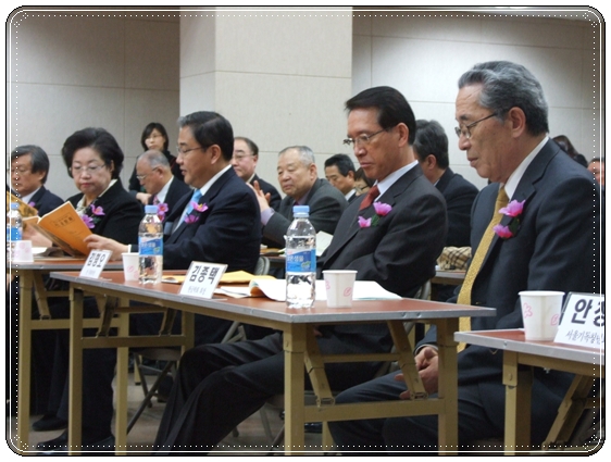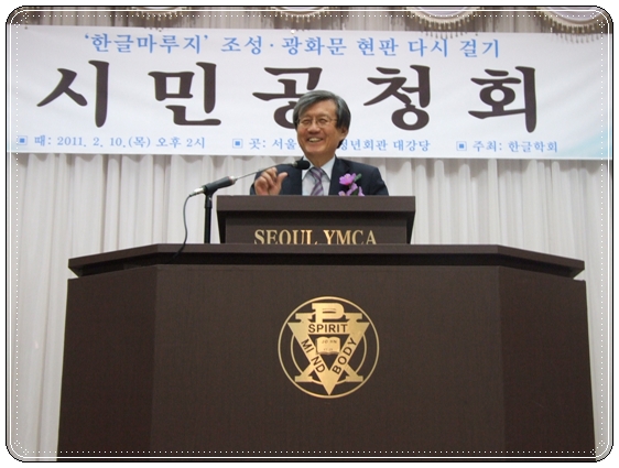 ▲ 2011년 2월 11일 오후 2시부터 서울기독교청년회관(YMCA, 종로2가) 대강당에서 열린 '한글마루지 조성/광화문 현판 다시 걸기 시민 공청회'의 모습. 방청석에 앉아 있는 김종택 한글학회 회장, 김형오 전 국회의장, 박진 의원, 김을동 의원, 이태진 국사편찬위원장(위 사진의 앞줄 오른쪽부터)과 기조 발언을 하고 있는 이태진 위원장(아래 사진)의 모습.